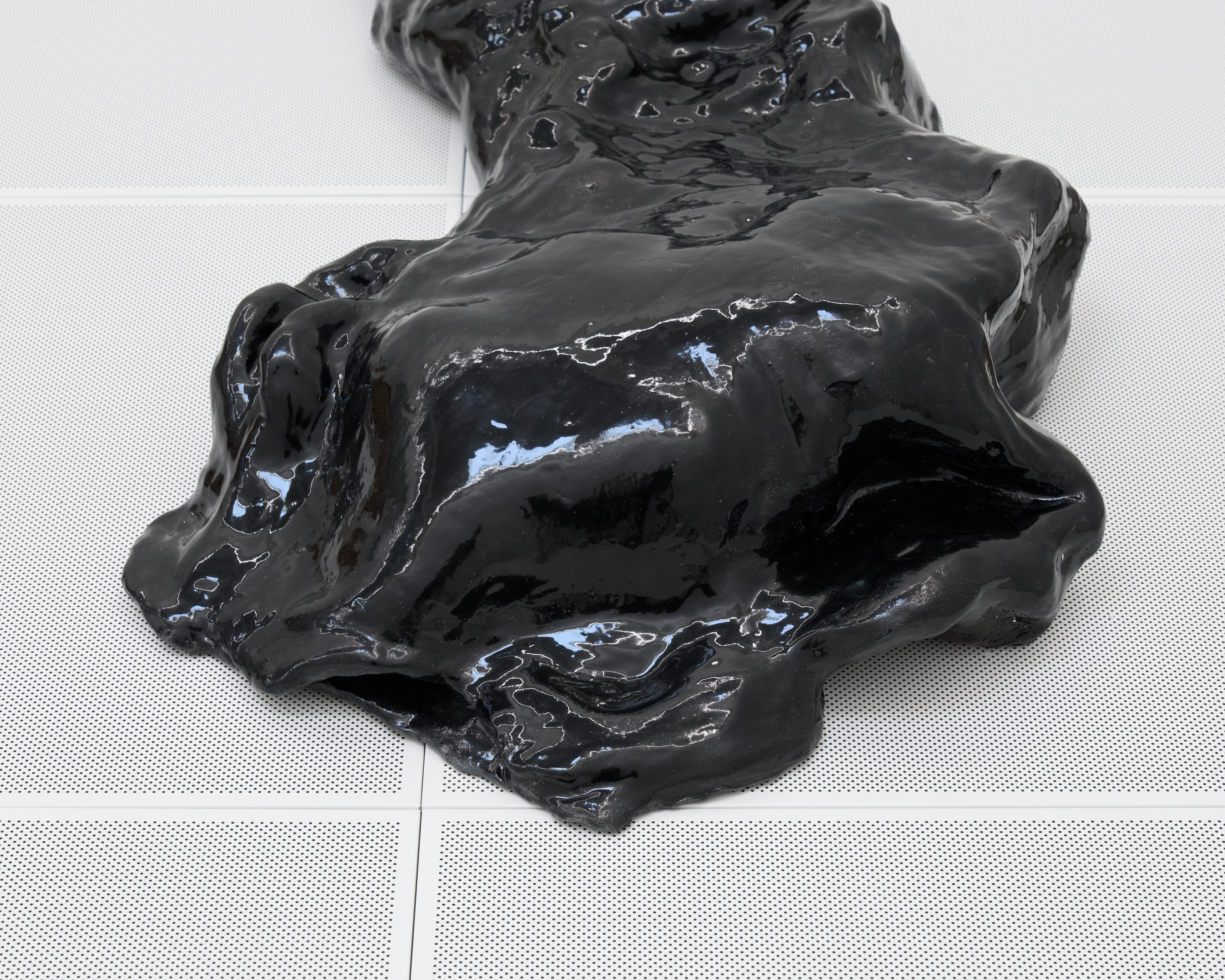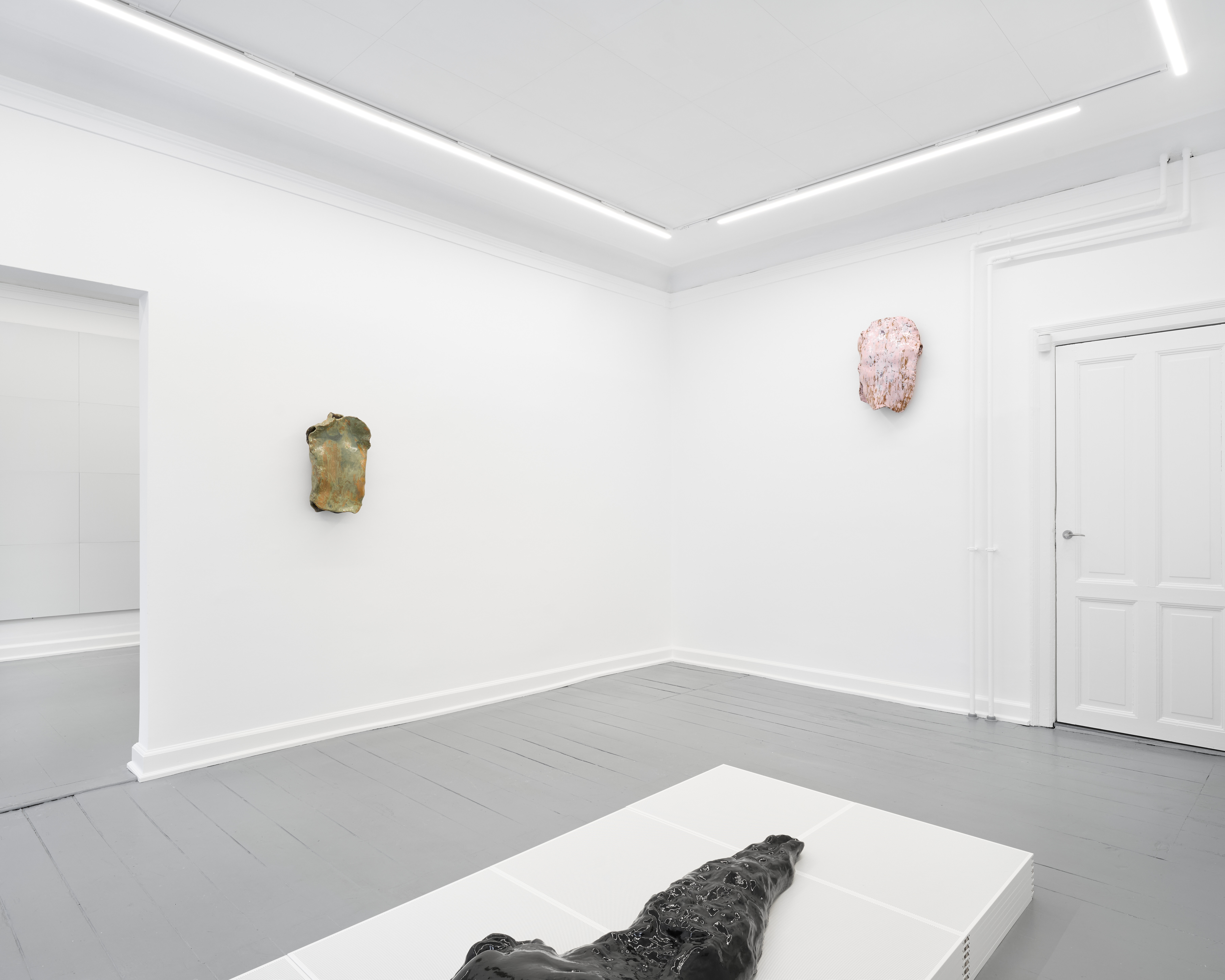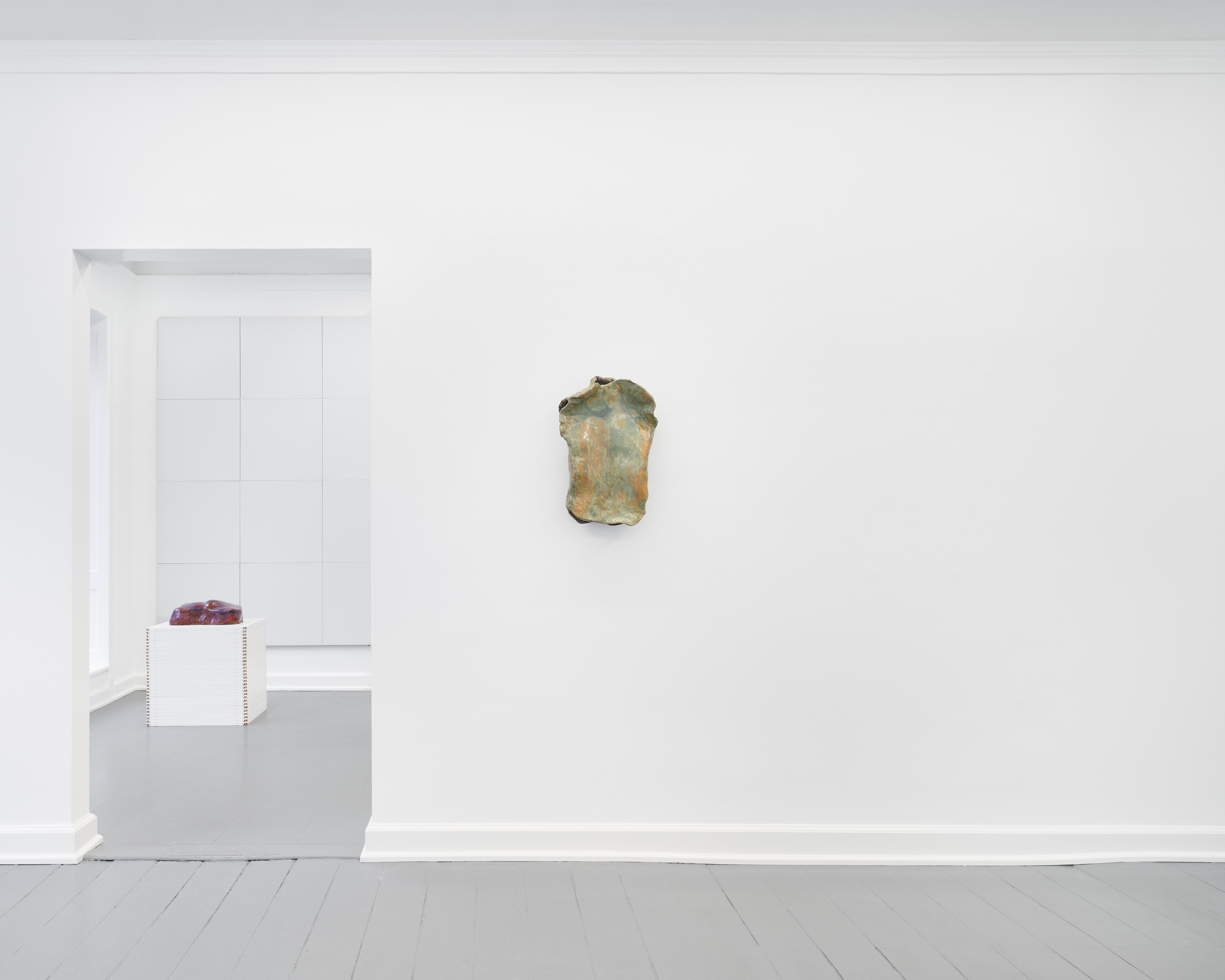 It is within this sculptural terrain that the architectural reference returns. Clip-In takes its title from the product designation of the perforated hospital ceiling panels. Reoriented, stacked, and reconfigured as a wall element and sculptural supports, these panels function less as motifs than as a faint architectural memory that once framed vulnerability and now subtly shapes perception.