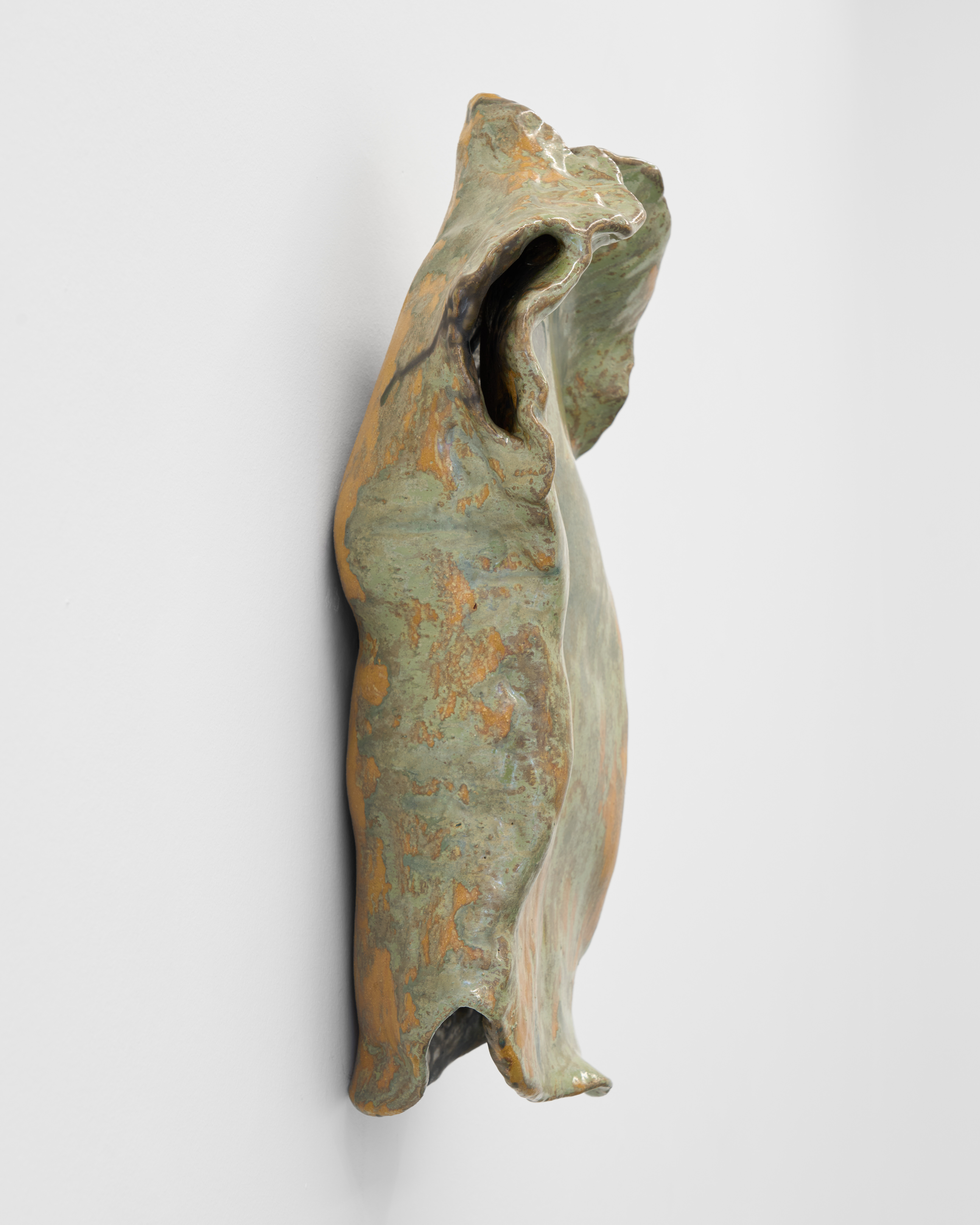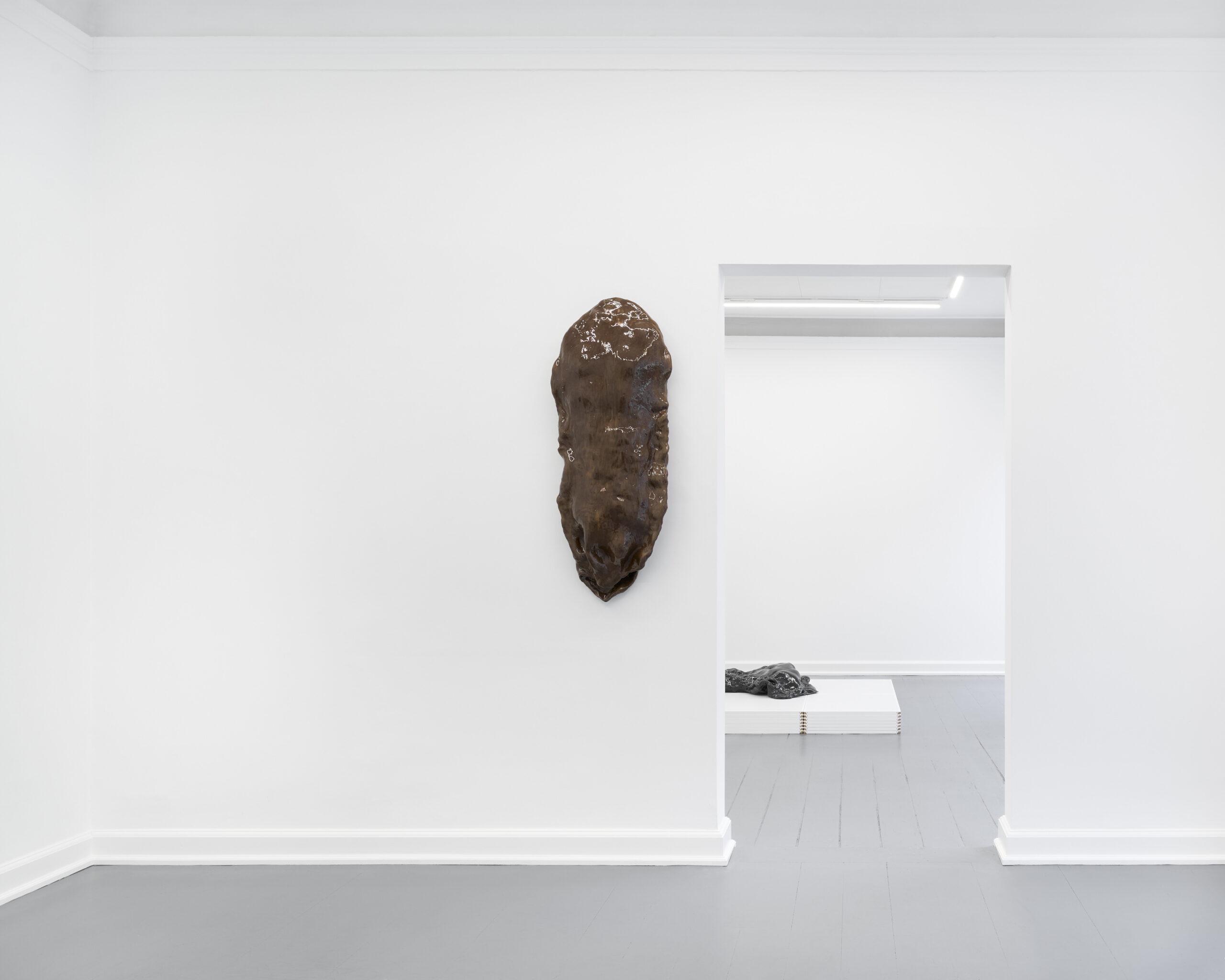 In Clip-In, his first exhibition with NILS STÆRK, Di Fabio introduces new wall-hung and floor-based sculptures. Most works in the exhibition originate from casts of his torso in clay, acting as a point of gestural departure. Once lifted from the mold, the forms open and stretch, loosening themselves from the body that initiated them. Repetition guides this unfolding: the gestures of casting and reshaping accumulate over time, leaving traces that drift from their bodily source and settle into hybrid imprints, part mechanical and part biological. The sculptures feel intimate yet estranged, gestures that recall a beginning without returning to it.