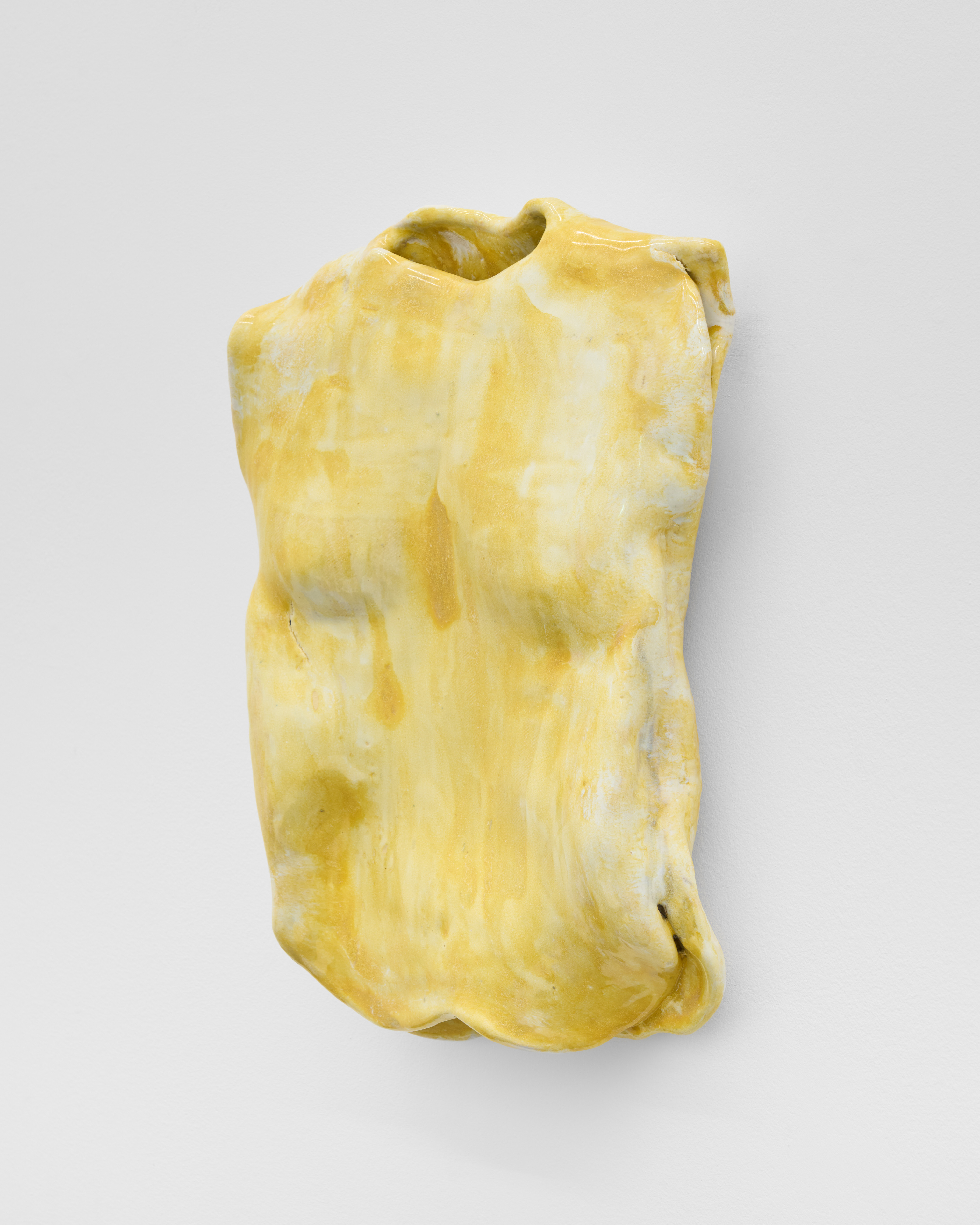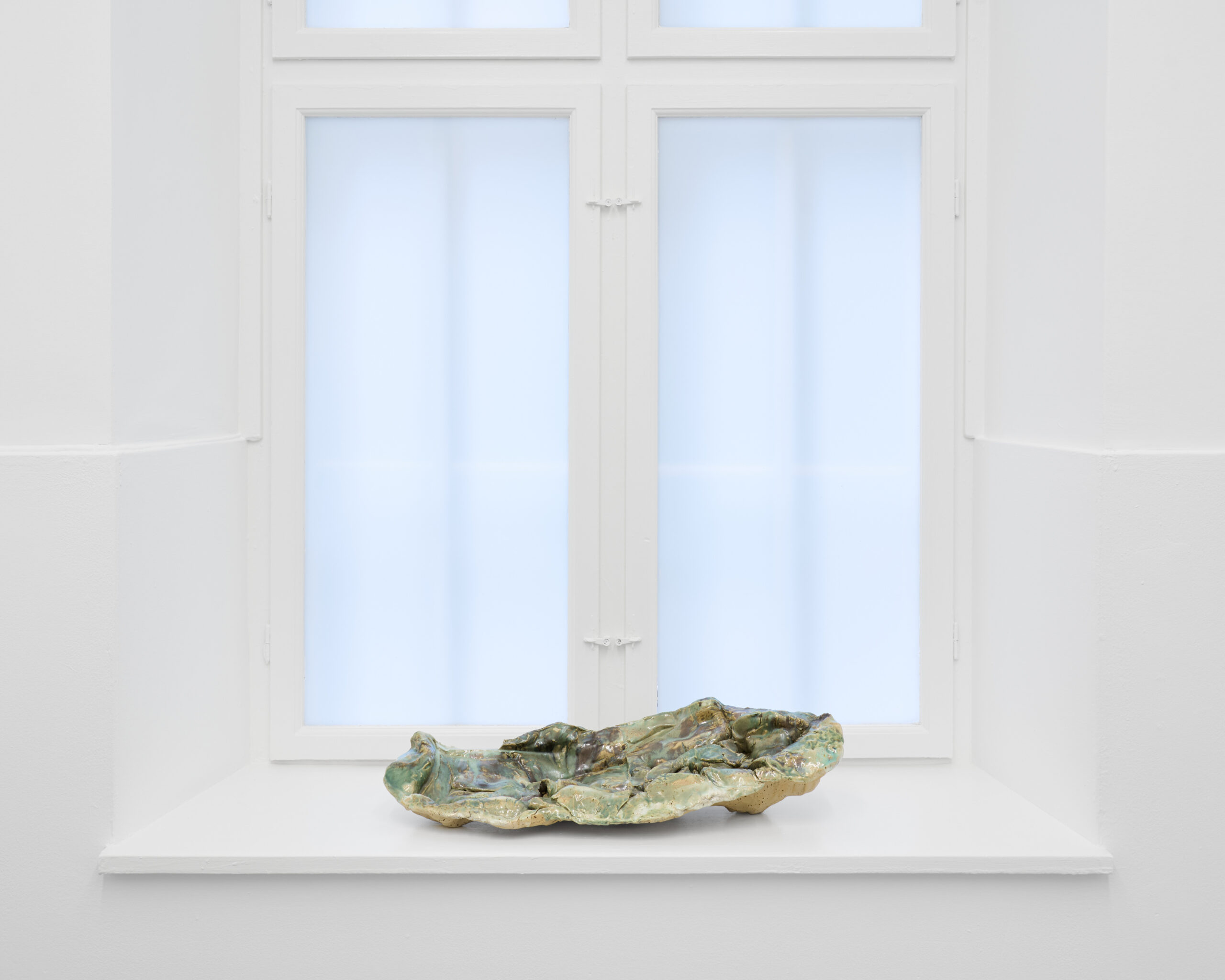 Di Fabio’s works take on a quiet autonomy, appearing less as objects than as forms in a state of becoming. One encounters sculptures that lean, fold, swell, or settle into precarious postures, carrying the logic of the body through impulse rather than depiction: a contour folding as if remembering pressure, a mass tilting as if testing its own gravity. This tension deepens through the firing process, where clay undergoes its own internal transitions: shrinking, tightening, and fixing impulses that began as soft gestures. The sculptures pause in moments of suspension, negotiating between collapse and elevation. Their glazed surfaces shift between saturated and luminous tonalities, reinforcing the sense of forms still discovering their presence.